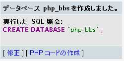 5、管理画面に入ると、「新しいデータベースを作成します」と言うメニューがあるので、テキストボックスに、データベース名【php_bbs】を入力して「作成」ボタンを押します。その後、このような画面があれば、OKです。エラーの場合は、わかりやすくエラーが出ます。ここで覚えておいて欲しいのは、データベースを操作すると、そのときのSQL文が表示されることです。これは、PHPからSQLを使ってデータベースを操作す