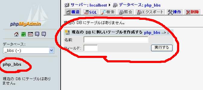 6、データベースが作成されると、左のフレームにphp_bbsが表示されていますので、クリックします。